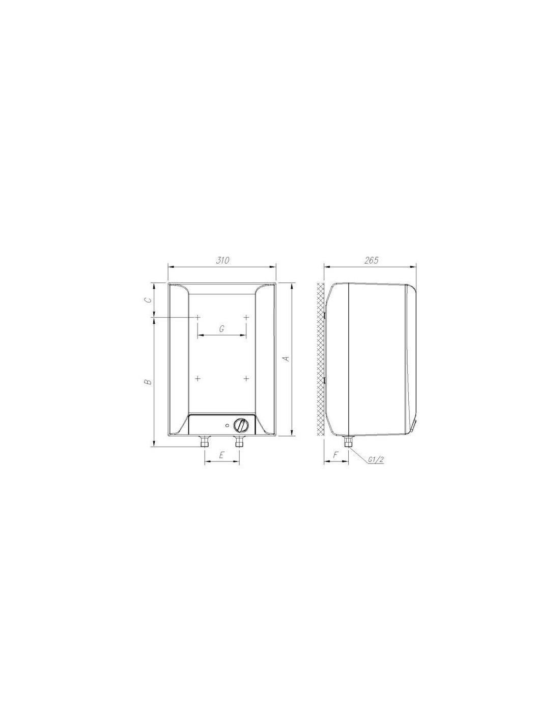 Visina: 454 mmŠirina: 310 mmDubina: 265 mmDimenzije zapakiranog aparata (ŠxVxD): 32 × 50 × 27,5 cmDimenzija B: 398 mmDimenzija C: 102 mmDimenzija E: 100 mmDimenzija F: 70 mmDimenzija G: 140 mmPriključci na vodovodnu mrežu: G 1/2Neto težina aparata: 4,4 kgBruto težina aparata: 5 kgTežina s vodom: 14 kgOsigurač: 10 A
