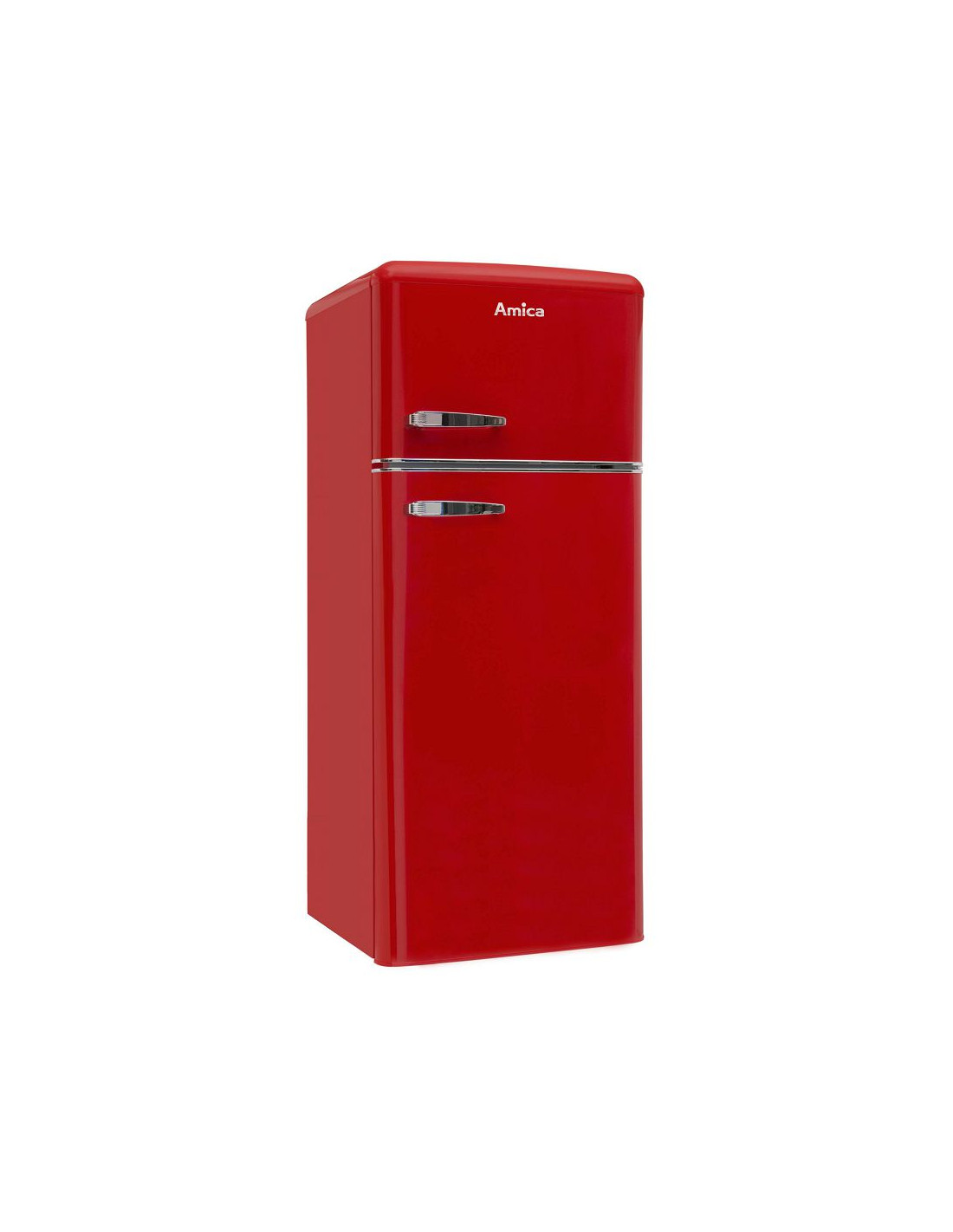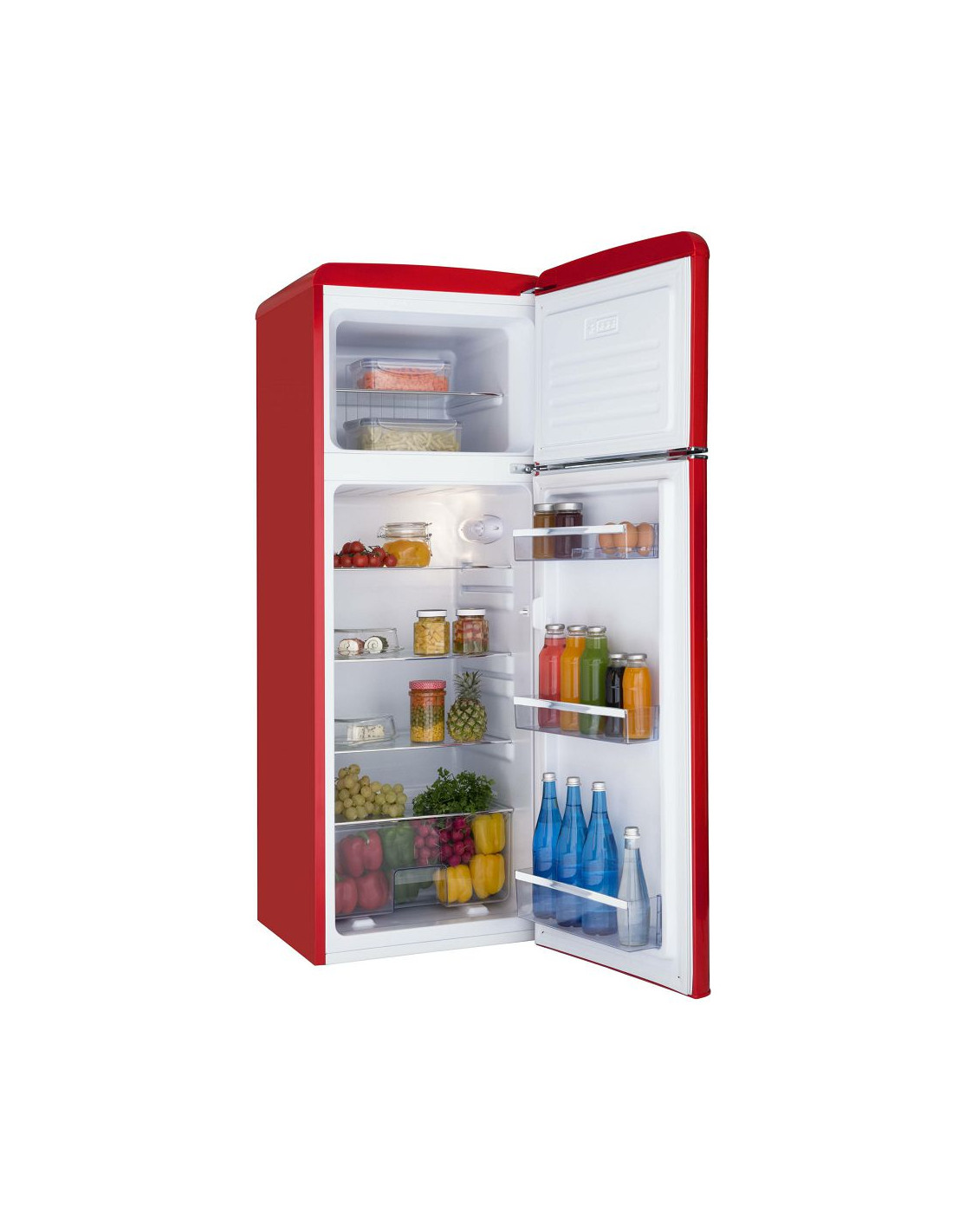 boja: crvena, ručke i rub između hladnjaka i zamrzivača od inoxa vrsta uređaja: samostojeći, dvokrilni ukupna bruto zapremnina: 210 L zapremnina hladnjaka: 164 L broj polica: 3, kaljeno staklo broj polica u vratima: 3 broj spremnika za voće i povrće: 1 LED rasvjeta zapremnina zamrzivača: 44 L broj polica u zamrzivaču: 1 razred zamrzavanja: */*** održavanje temperature u slučaju nestanka struje: 12 sati antibakterijski sustav otvaranje u desnu stranu godišnja potrošnja energije: 172 kWh dimenzije (V x Š x D): 144 x 55 x 61,5 cm