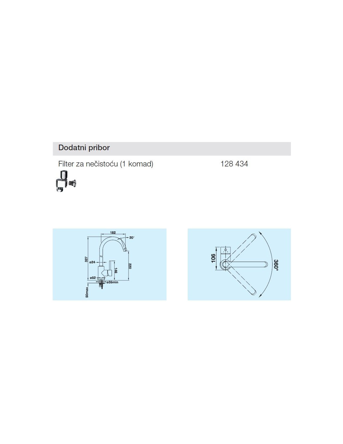 BLANCO MIDA• visoka pipa za jednostavno punjenje velikih lonaca i vaza• slavina pomična za 360° – proširuje radni radiusKarakteristike--pipa s jednom ručkom--slavina pomična za 360°--potreban otvor O 35 mm--keramičke brtve--savitljive priključne cijevi, duljine 350 mm s maticom za naročito laganu i sigurnu montažu--ispitano kod LGA (šum 1.